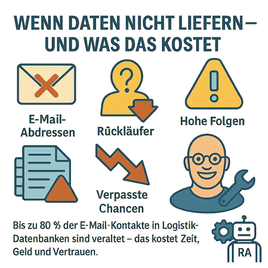 Die Datenqualität in der Logistik lässt sich gezielt durch Automatisierung verbessern – mithilfe von Robotic Process Automation (RPA) und Künstlicher Intelligenz (KI). RPA übernimmt die laufende Prüfung und Aktualisierung von Stammdaten: Es erkennt Dubletten, prüft E-Mail-Adressen und gleicht Daten mit externen Quellen wie Handelsregistern ab. KI ergänzt diese Prozesse, indem sie Schreibfehler identifiziert, fehlende Informationen wie Ansprechpartner oder Branchenzugehörigkeit ergänzt und Kontakte intelligent kategorisiert. Die Umsetzung erfolgt in vier Schritten: Datenanalyse, automatisierter Abgleich, intelligente Anreicherung und Integration in ERP-, CRM- oder Newsletter-Systeme mit laufendem Monitoring. So entsteht ein skalierbarer, fehlerfreier Datenbestand – als Grundlage für effiziente Logistikprozesse.